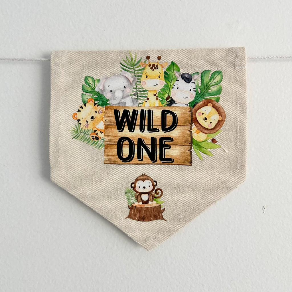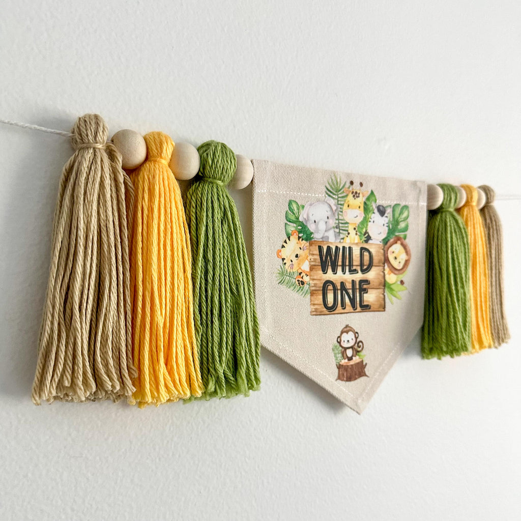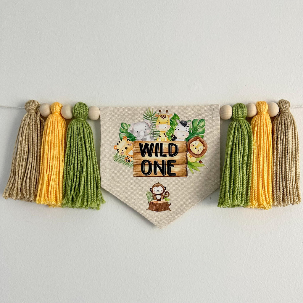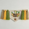 The center flag has a board with the words WILD ONE in black with a lion, elephant, tiger, giraffe, zebra and monkey surrounding it. There are 3 tassels on each side in sage green, yellow and tan.