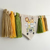 Tassels are approximately 5.5" long. The completed full banner is approximately 16" wide and the jute string is approximately 110" in length.