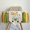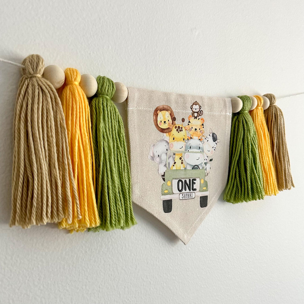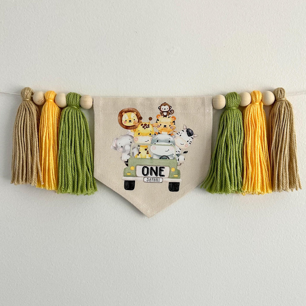 The center flag has a cute safari truck with a lion, elephant, tiger, giraffe, zebra, hippo and monkey in the back. The word ONE is on the back of the truck in black. There are 3 tassels on each side in sage green, yellow and tan.