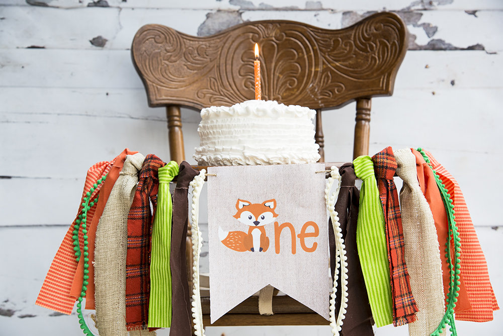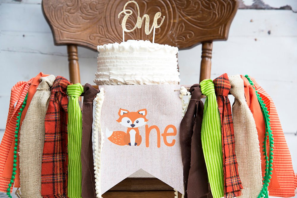 FINAL SALE! Fox First Birthday Party Decor, perfect for a Woodland themed photo prop. This highchair banner features a cute fox which helps to spell the word one. Fabric ties with a forest theme are added to coordinate with the woodland animal party decor.