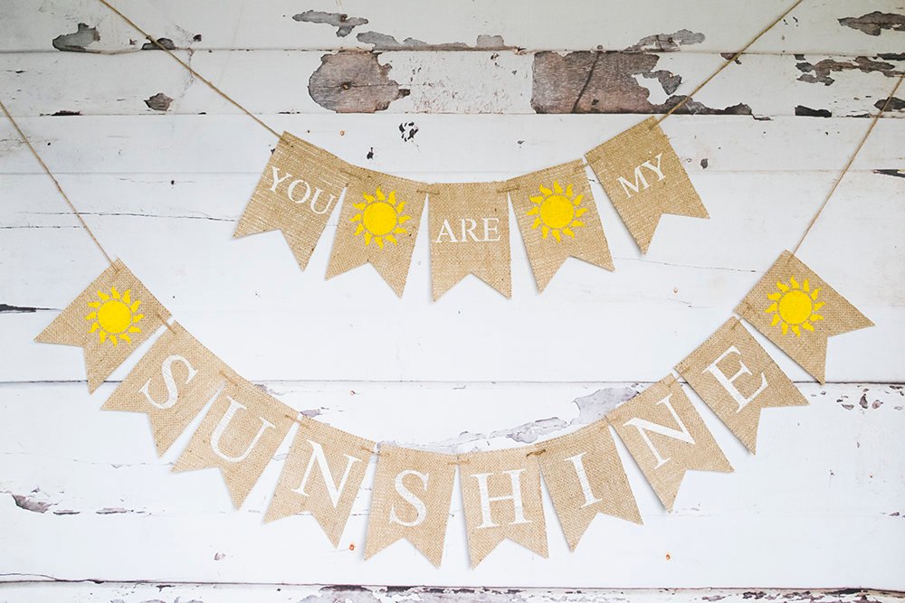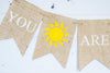 Little Sunshine birthday party decor, You are my sunshine banner. Perfect for a summer baby shower or a birthday party. Two yellow suns are painted onto burlap along with the famous words You are my sunshine.